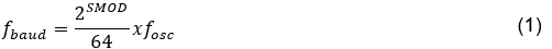 All formulas or equations must be created using Equation Editor or MathType (http://www.mathtype.com). Equations should start aligned to the left margin, consistent with the text above them. Each equation must be numbered sequentially in parentheses on the right margin and referenced in the text. All symbols used in equations must be defined, either before or after the equation. For example, Equation (1) shows how to determine the baud rate frequency in Mode 2 serial communication for an 8051 microcontroller: