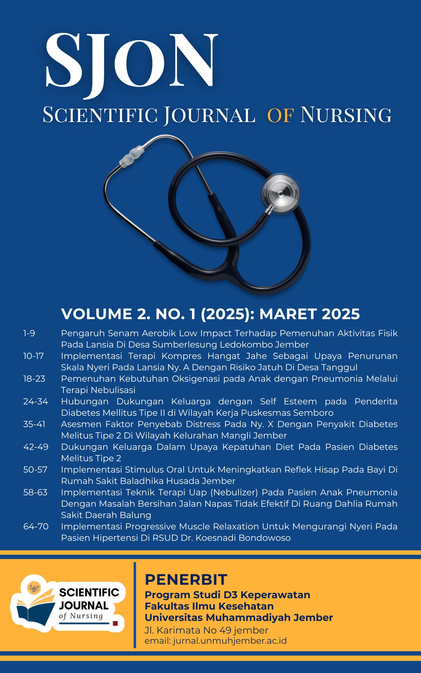 Scientific Journal of Nursing is a Journal of Nursing managed by the D.III Nursing Study Program, Faculty of Health Sciences, University of Muhammadiyah Jember. SJoN was established in 2021 with a focus area on nursing. Scientific Journal of Nursing is a scientific publication journal published 2 times a year (March and October) using a peer review system for article selection, which is intended for publication from academics, professionals, practitioners and nursing students. In its publication, the Scientific Journal of Nursing can receive articles that are appropriate to the field of nursing in the form of research articles, literature reviews, and case reports or case studies.