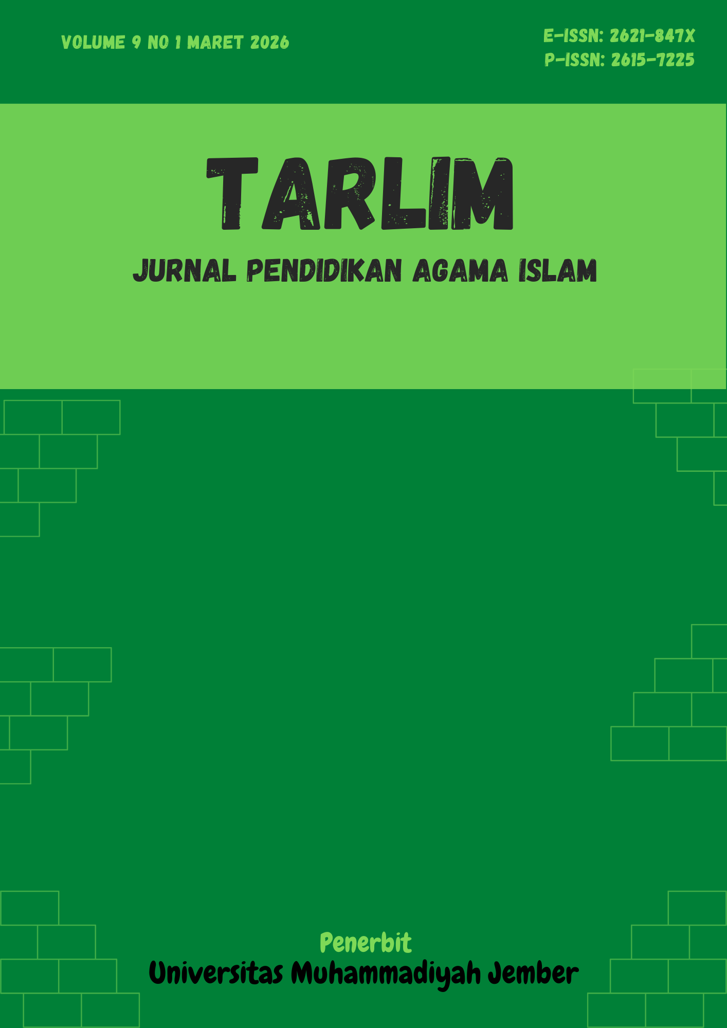 Vol. 8 No. 2 (2025)Kami ucapkan Alhamdulillah segala puji bagi Allah SWT, yang telah memberikan rahmat dan hidayah-Nya, sehingga jurnal TARLIM menerbitan edisi Vol. 8 No. 2 September 2025. Terbitnya Jurnal TARLIM Program Studi Pendidikan Agama Islam Fakultas Agama Islam Universitas Muhammadiyah Jember diharapkan dapat meningkatan kualitas penelitian dan publikasi ilmiah. Pada edisi ini, jurnal TARLIM berisi 14 artikel dari hasil penelitian dan kajian kritis. Pada edisi ini, artikel-artikel yang diterbitkan meliputi masalah-masalah dan kajian penelitian berupa : The Role of the Islamic Religious Education Curriculum in Character Development: A Study of Challenges and Educational Impact in Indonesia, Kawin Cai: Interaksi Agama Islam dan Budaya, Konsep Pendidikan Multidisipliner Berbasis Paradigma Twin-tower di Lingkungan Pesantren, The Dynamics Of Islamic Religious Education In The Era Of Khulafur Rasyidin, Efektivitas Pemanfaatan Media Artificial Intelligence pada Pembelajaran Pendidikan Agama Islam, Ketahanan Ṣaḥīḥ Al-Bukhārī Terhadap ‘Illah: Studi Hadis Safar Perempuan Dalam Perspektif Pendidikan Karakter, Rekonseptualisasi Peran Guru dalam Inovasi Kurikulum Pendidikan Agama Islam di Era Kurikulum Merdeka, Upaya Membentuk Karakter Disiplin Melalui Kegiatan Keagamaan pada Mata Pelajaran Akidah Akhlak, Model Evaluasi Kompetensi Spiritual Digital Peserta Didik Pada Pembelajaran Pendidikan Agama Islam di Era Industri 4.0, Peningkatan Motivasi Belajar PAI Siswa Kelas 2 Melalui Media Pembelajaran Interaktif Wordwall, Implementasi Metode Ziyadah dan Muroja’ah dalam Meningkatkan Kualitas Hafalan Al-Qur’an Santriwati di Pondok Pesantren Maslakul Qur’an Cluwak Pati, Implementasi Hafalan Hadist Pendek Untuk Meningkatkan Pembentukan Karakter Santri, Penanaman Nilai Moderasi beragama Pada Siswa Sekolah Dasar Melalui Ekstrakurikuler, hasil penelitian dengan judul Peran Pendidikan Orang Tua Dalam Menumbuhkan Konsistensi Sikap Keagamaan Anak Melalui Pendidikan Agama Islam.